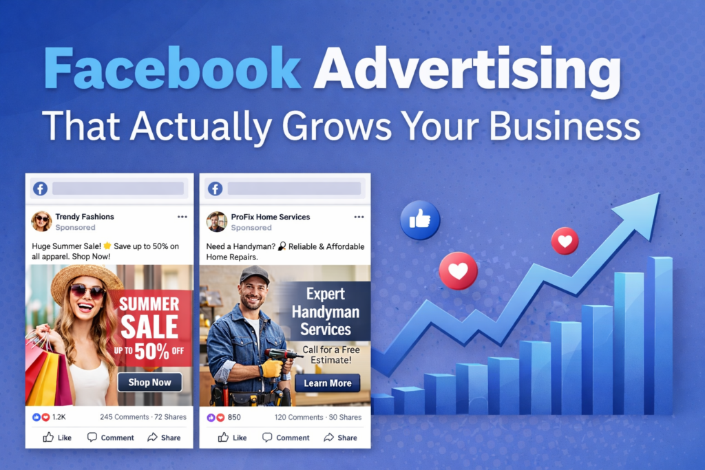 - If your ideal customers are on Facebook and Instagram — and they are — then your business should be too. We help businesses turn attention into leads, bookings, and sales using data-driven Facebook advertising that delivers real ROI.